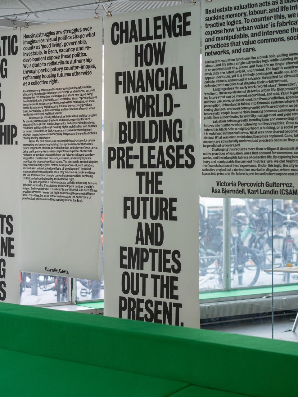 Embedded with the spirit of municipalism—the idea that real political power should live at a local scale—the exhibition Soft Civic Infrastructures brings the first experiences and learnings from Esch-sur-Alzette to Copenhagen, where it is presented both as a spatial and social device. Rooted in the dual premise of our research project titled The Esch Clinics—that spatial practice can both read and construct social infrastructure—this iteration extends the project into a new institutional and political context.
